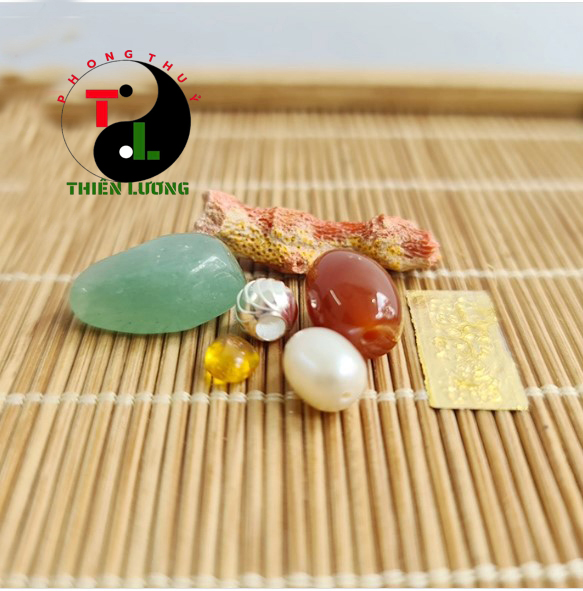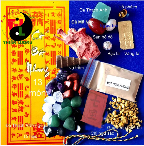 Nguyên liệu: 13 món gồm Đá thạch anh xanh, mã não đỏ, hổ phách Nga, san hô đỏ, ngọc trai, Bạc ta, Vàng 9999, đá thạch anh ngũ sắc, di hiệu, bột trầm và nụ trầm, bộ xu lục đế, gạo vàng thần tài, chỉ ngũ sắc.